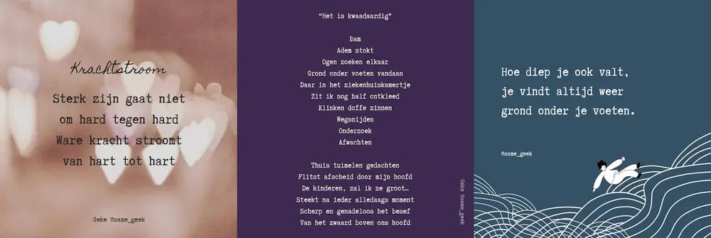 Intussen schrijft Geke door en blijft ze haar mooie gedichten online delen. ‘Omdat ik natuurlijk schrijf over wat me bezighoudt, komen de thema’s ziekte en afscheid nemen hierin ook steeds vaker voorbij. Ik kan me voorstellen dat dit voor anderen herkenning kan geven.’  *