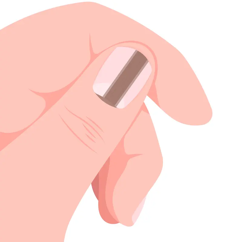 Een acraal melanoom kan eruitzien als een onregelmatige, donkergekleurde vlek of streep onder de nagel of als een donkere vlek op de voetzool. Het wordt vaak verward met een blauwe plek of bloeduitstorting.